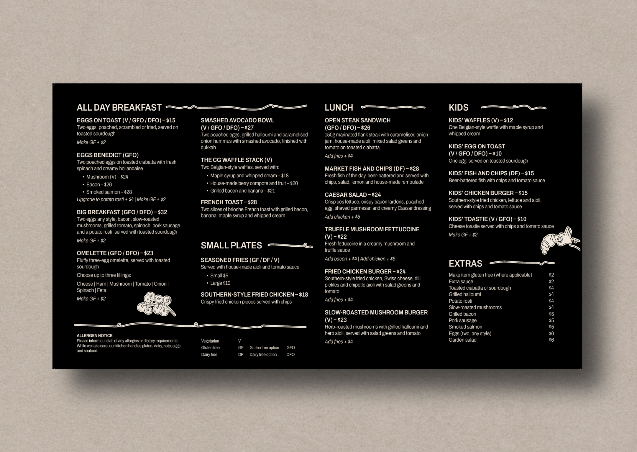This meant updating the brand touchpoints — menus, signage, and collateral — to feel considered, contemporary, and inviting, without ever feeling like a departure from what people loved.